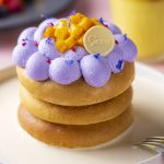 Pancakes de vainilla, acompañados de crema de lavanda, salsa de 3 leches y trocitos de mango fresco.