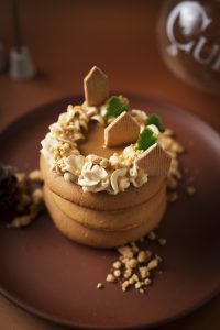 Pancakes de caramelo, crema helada de café y galletitas de especias.