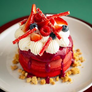 Pancakes rellenos de frutos rojos, glaseado de chocolate, frosting de queso y merengues de menta.